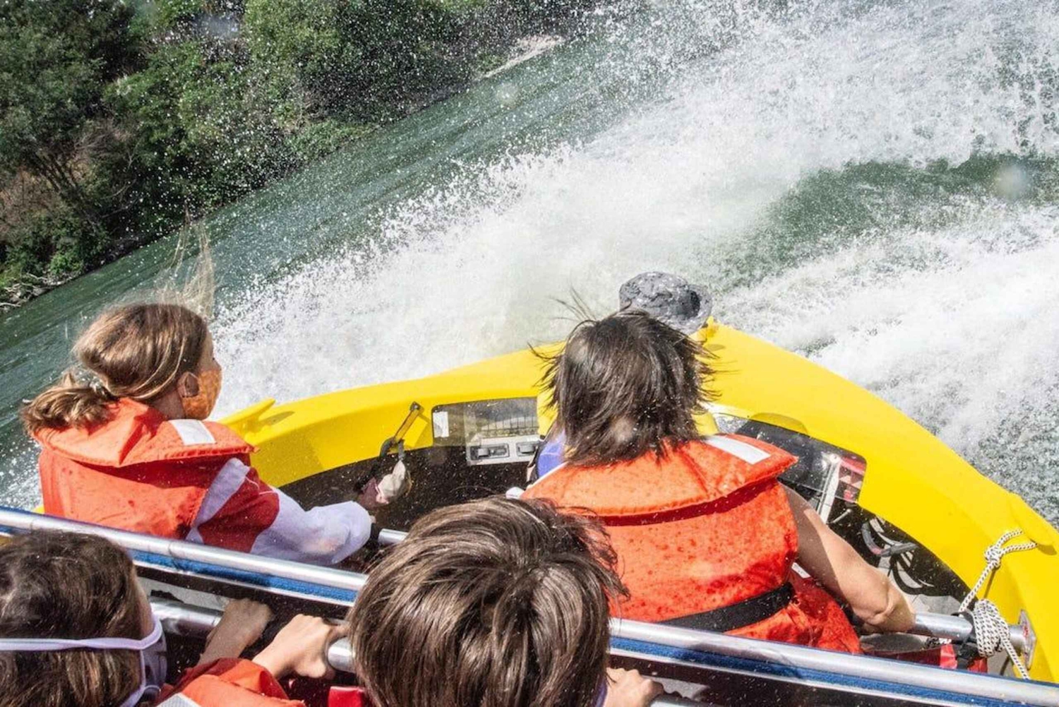 Scegli tra tre opzioni: 60 minuti di 'Jet Boating' (bagnato fradicio/ evento principale), 20 minuti di 'Spin Boating' (media intensità/ leggermente bagnato) o 45 minuti di 'Panorama Cruise' (bassa intensità/ asciutto):