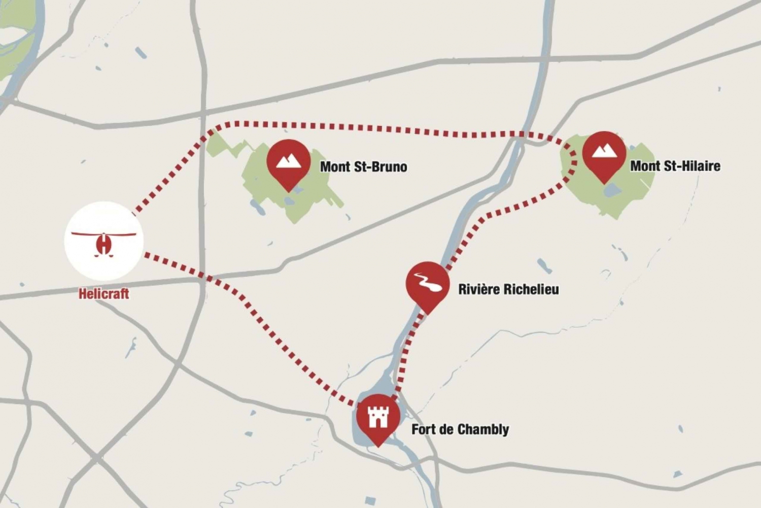 Discover all the splendor of Montérégie Region by flying over the nature of Mont Saint-Bruno and the Mont Saint-Hilaire park. The reflections of the Richelieu River will take you to the Chamblis basin and its historic Fort, before a final panoramic flight over the Saint-Hubert airport.